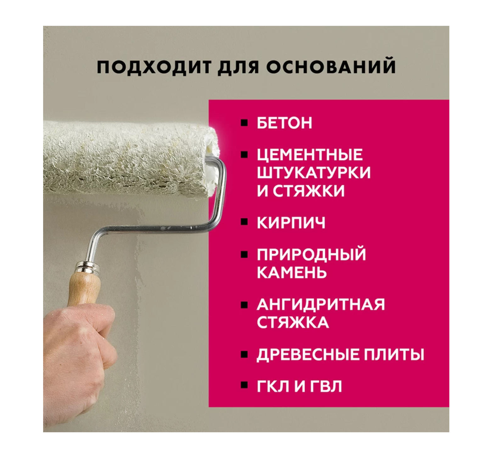 Применяется для обработки всех видов впитывающих оснований: цементных штукатурок и стяжек, известковых и гипсовых штукатурок, легкого и ячеистого бетона, ангидритных стяжек, кладок из кирпича и природного камня, древесностружечных и древесноволокнистых плит, гипсокартона и т.д.